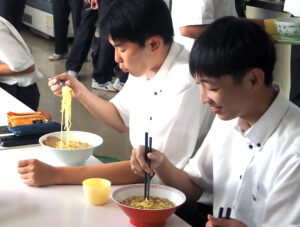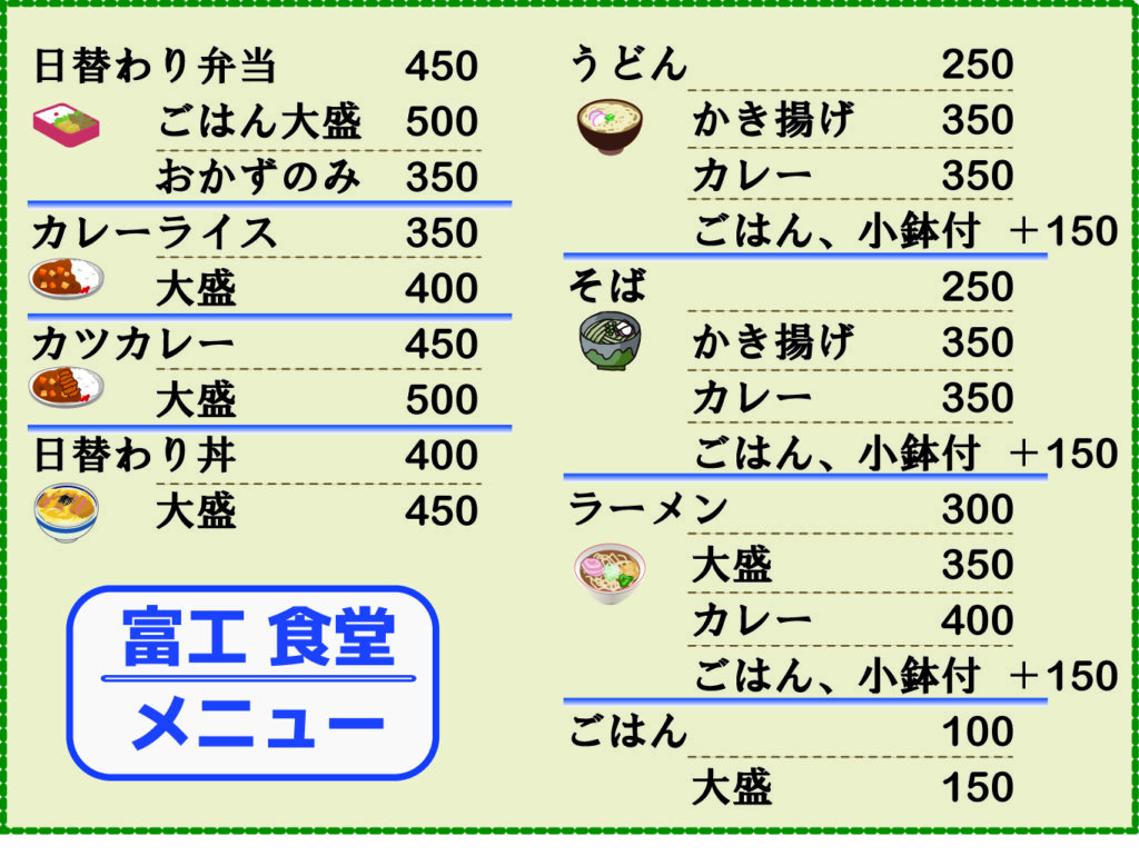 高校生活の楽しみの一つが「食」勉強や実習で疲れた頭と体を癒やしてくれるスポットといえば、やっぱり食堂!富山県の高校では食堂がだんだん少なくなってきていますが、富工にはあります!! 4時限終了後、生徒達が一目散に向かうのが、この場所。育ち盛りの生徒達の空腹を満たしてくれる食堂はとても大切な存在です。富工の特徴でもある部活動の中でも特に運動部の生徒達にとっては、体を作る上でとっても大切な食の部分を支えてくれる重要なパートナーでもあります。