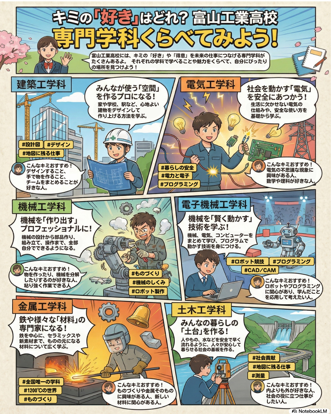 未来のものづくりを担う、あなたの夢がここにある! 本校の6つの専門学科が、社会を動かす「技術」と「知識」を深掘りします。 ※画像をクリックすると拡大(※Instagramでの投稿) 機械工学科 80名 2クラス 精密な部品加工から、社会の仕組みを理解する機械設計まで、ものづくりの原点を学ぶ。 電子機械工学科 40名 1クラス 機械・電気・コンピュータを融合し、相撲ロボットやマイコンカーレースなど、未来の賢い機械を創造する。 金属工学科 40名 1クラス 全国唯一の専門学科として、1200℃の鋳鉄溶解や鍛造実習など、素材のプロフェッショナルを目指す。 電気工学科 80名 2クラス 高圧送電から家庭配線まで、電気エネルギーを安全に扱う技術を習得し、電気主任技術者(電験三種)などの国家資格に挑戦する。 建築工学科 40名 1クラス 2級建築士の受験資格を無試験で取得可能 。建築模型製作や、実際の施設「SCOP TOYAMA」の実現など、地図と記憶に残る空間をデザインする。 土木工学科 40名 1クラス 道路、橋、ダムなど社会基盤の設計・維持技術を学び、測量士補や2級土木施工管理技士といった必須資格の取得を目指す。 気になる学科を選択してください。 Pages : 1 2 3 4 5 6 7