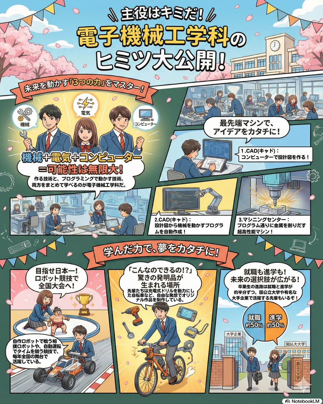 未来への武器 | Weapons for the Future機械系・電気系の資格に加え、コンピュータの知識を活かせる「ITパスポート」など情報系資格も取得可能。就職と進学が約5割ずつで、国公立大学への進学者や大手情報系企業に就職する卒業生もいるなど、進路の幅広さが最大の魅力です。 取得可能資格: 機械製図検定、第二種電気工事士、ITパスポート、計算技術検定、危険物取扱者、機械加工技能士、ITパスポート試験、情報技術者試験 その他 卒業後の進路: 機械・制御系企業、大手IT企業、国公立大学進学など |