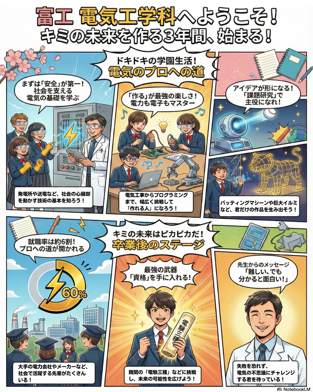 学びの核心 | Core of Learning生活に不可欠な一方、扱いには危険も伴う電気。その原理を理解し、安全に取り扱うための知識と技術を第一に学びます。発電所からの高圧送電(50万ボルトなど)から家庭の配線まで、社会を支える電力技術と電子技術の基礎を幅広く網羅します。 キーワード: 電気の安全、高圧送電、電力・電子技術 |