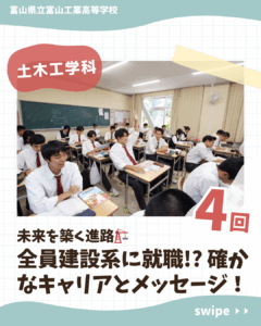 未来への武器 | Weapons for the Future土木技術者にとって必須の国家資格「測量士補」「2級土木施工管理技士」の取得を全員で目指します。 近年、就職希望者は全員が建設関連企業や公務員(土木技術職)として採用されており、社会を支える確かなキャリアを築きます。 取得可能資格: 計算技術検定、情報技術検定、測量士補、2級土木施工管理技士、小型車両系建設機械特別教育講習、危険物取扱者 その他 卒業後の進路: 建設会社、コンサルタント、国・自治体(公務員技術職)など |